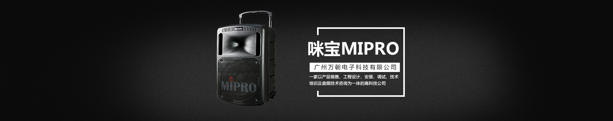 廣州萬朝電子科技有限公司成立于2008年,公司主要是一家以產品銷售、工程設計、安裝、調試、技術培訓及音頻技術咨詢?yōu)橐惑w的高科技公司。主要代理銷售產品包括:咪寶MIPRO,舒爾SHURE,森海塞爾SENNHEISER,BOSE專業(yè)音箱,JBL系列音箱,皇冠CROWN功放,QSC功放,聲藝SOUNDCRAFT調音臺,雅馬哈YAMAHA,DBX及AKG等周邊器材。